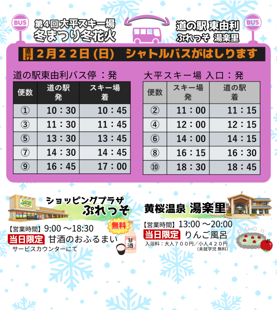 | 9:00 | スキー場営業開始 | リフト券(大人800円中学生以下500円)購入で スキー・スノーボード・ウェア レンタル無料! |