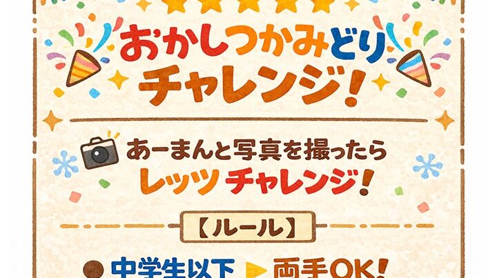 | 13:00 | あーまん登場 | あーまんと写真撮影 おかしのつかみどりチャレンジ! |
